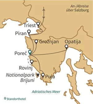 Auf Istrien findet der Gast alles, was Urlaub zu einem unvergesslichen Erlebnis macht. Himmel und Wasser strahlen im schönsten Blau, der Duft von Zypressen, Oleander und Rosmarin streichelt die Sinne. Die Luft ist klar und würzig, Pinienwälder spenden Schatten. Eingebettet in malerische Buchten finden sich romantische Fischerdörfer, die die Jahrhunderte unbeschadet überstanden haben und so einen besonderen Reiz auf den Betrachter ausüben. Schattige Gässchen und sonnenüberflutete Plätze wetteifern um die Gunst des Gastes. Im Frühling hat Istrien durch das satte grün einen zusätzlichen Reiz.