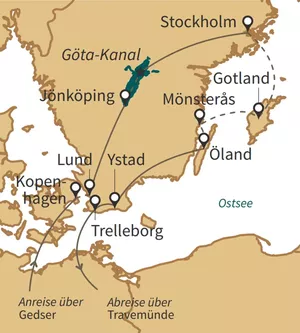 Erleben Sie Schweden von seiner schönsten Seite! Malerische Landschaften und rote Holzhäuschen erwarten Sie auf dieser Rundreise. Einer der Höhepunkte ist der Besuch von Stockholm - wunderschön auf 14 Inseln gelegen. Die schwedische Hauptstadt lockt mit unzähligen Sehenswürdigkeiten wie der Altstadt Gamla Stan, dem Königlichen Schloss oder dem Stadshuset. In Sörmland - bekannt durch die Inga Lindström Filme - warten viele pittoreske Städtchen mit farbenfrohen Holzhäusern und herrliche Natur auf Sie. Der Göta-Kanal mit seinen 190 Kilometern wird als „das blaue Band Schwedens“ bezeichnet. Dieser Wasserweg, der Stockholm mit Göteborg verbindet, galt einst als Weltwunder. Überzeugen Sie sich bei einer Bootsfahrt selbst davon! Damit aber nicht genug, denn die Inseln Gotland und Öland stehen genau so auf ihrem Reiseplan wie ein Besuch im Elchpark. Eine einzigartige Reise mit riesigen Leistungspaket, zur besten Reisezeit und deshlab unser Reisetipp 2026 für Sie.